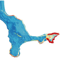 False-colour DTM of the Phoenician peninsula with yellow areas indicating submerged land. -