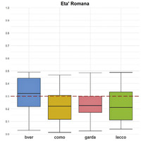 Plot dei valori predittivi dei siti del Basso Verbano, comparati con i valori dei siti dell’area lariana e gardesana. Le superfici predittive di riferimento sono state calcolate utilizzando i risultati del calcolo di regressione logistica multivariata effettuato per l’area del Basso Verbano -